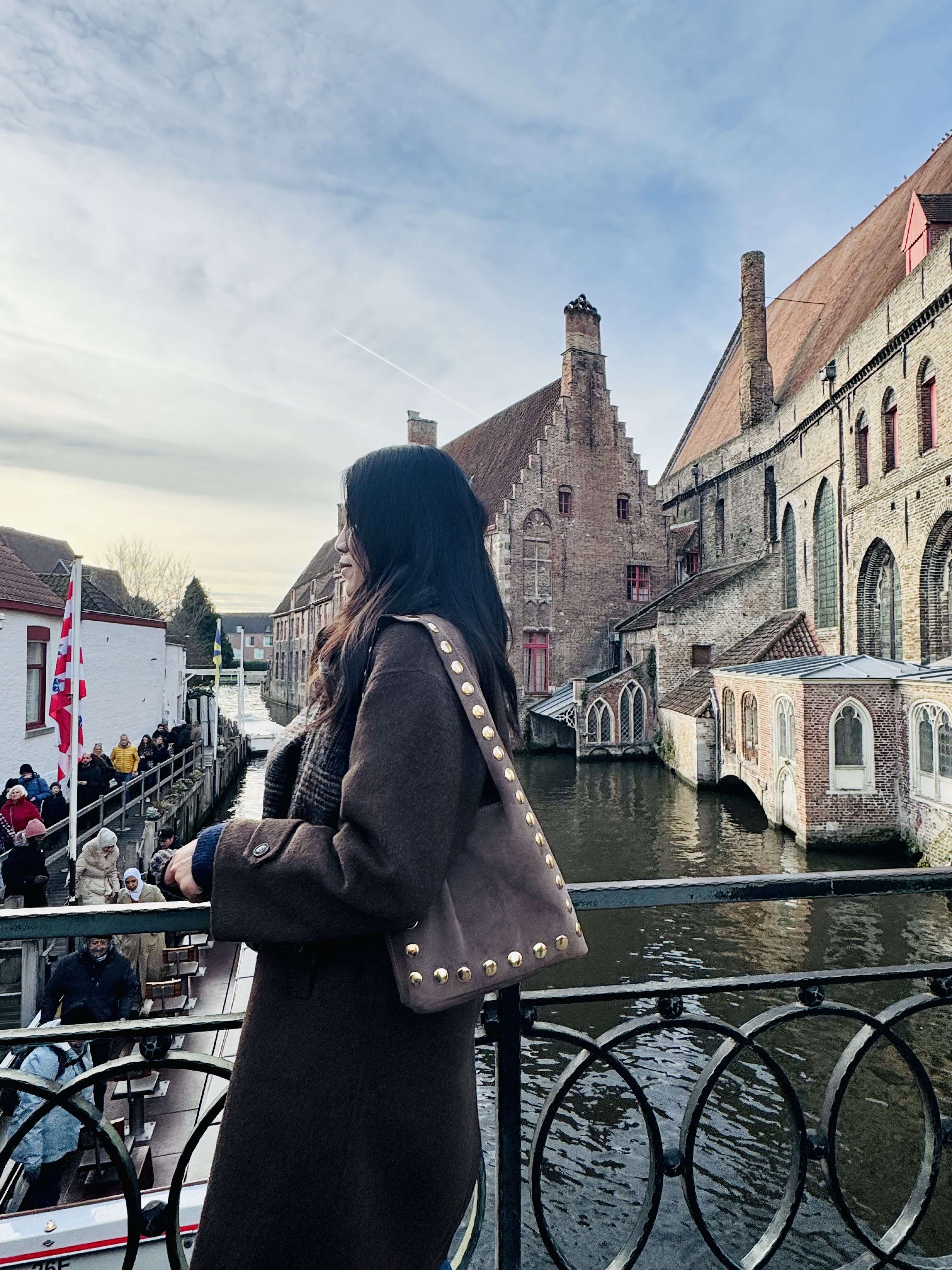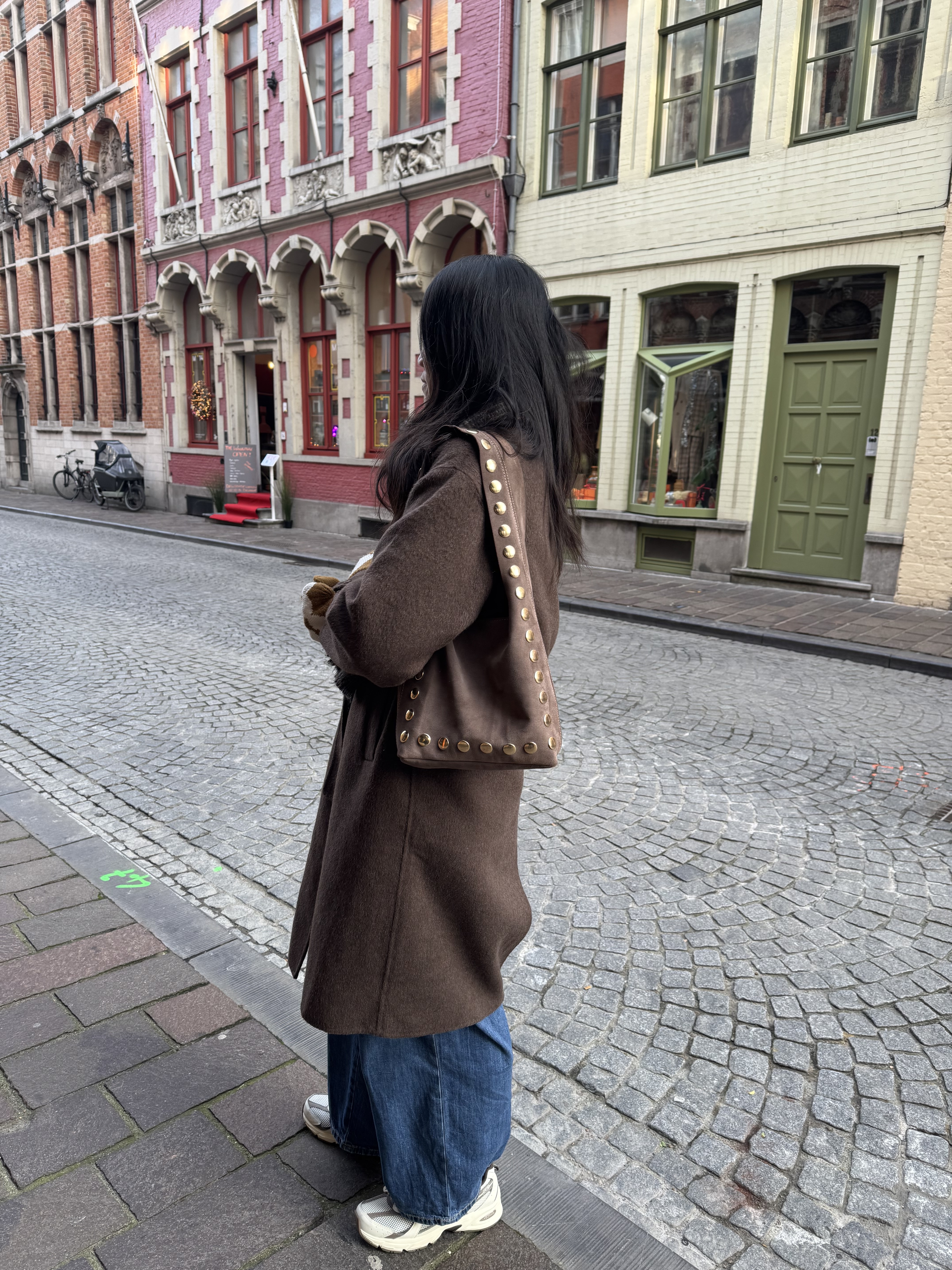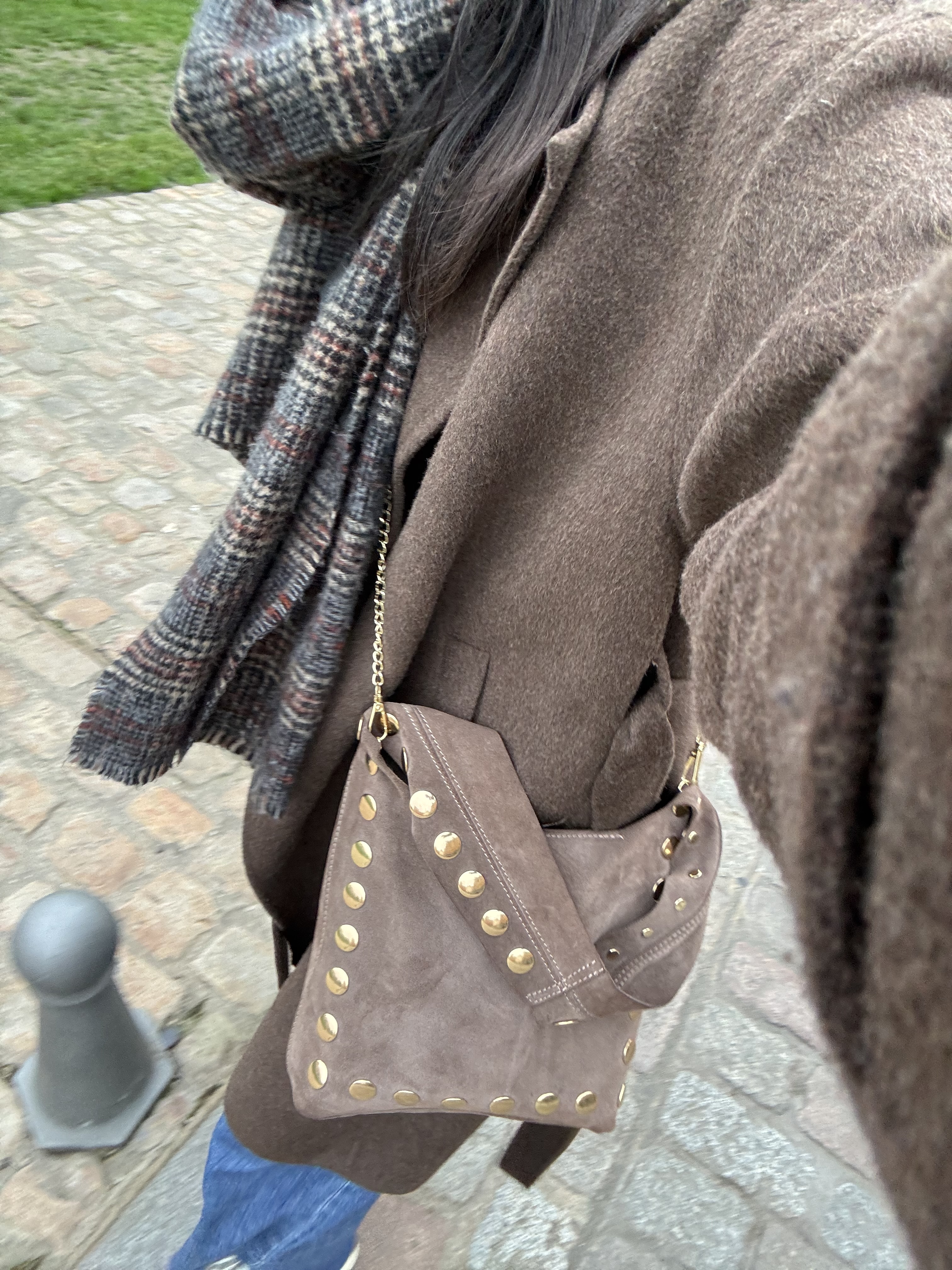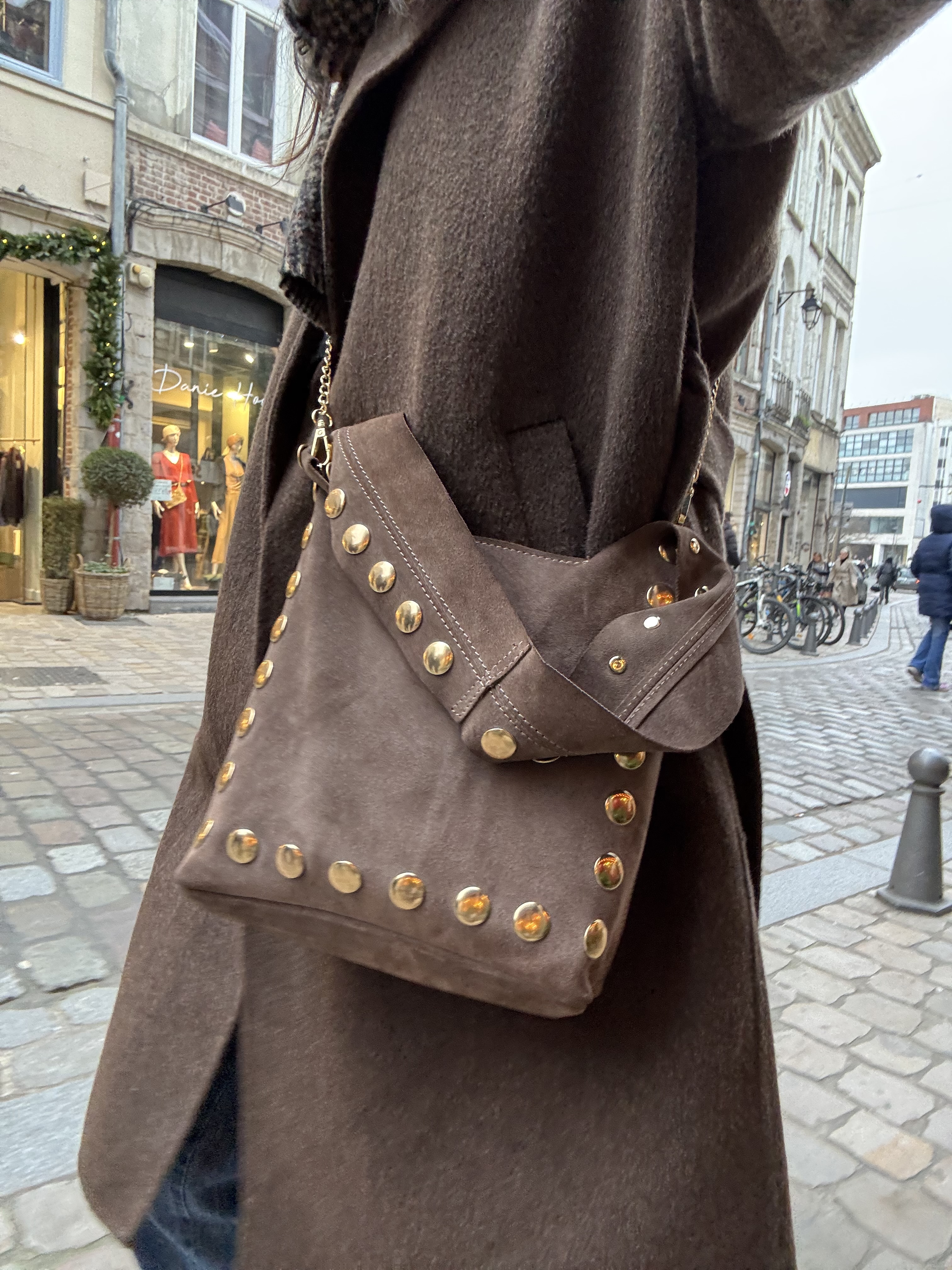 Gold studs on the front of the bag.