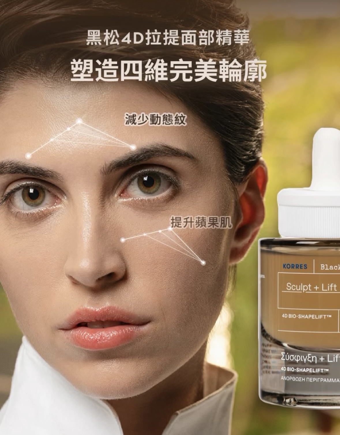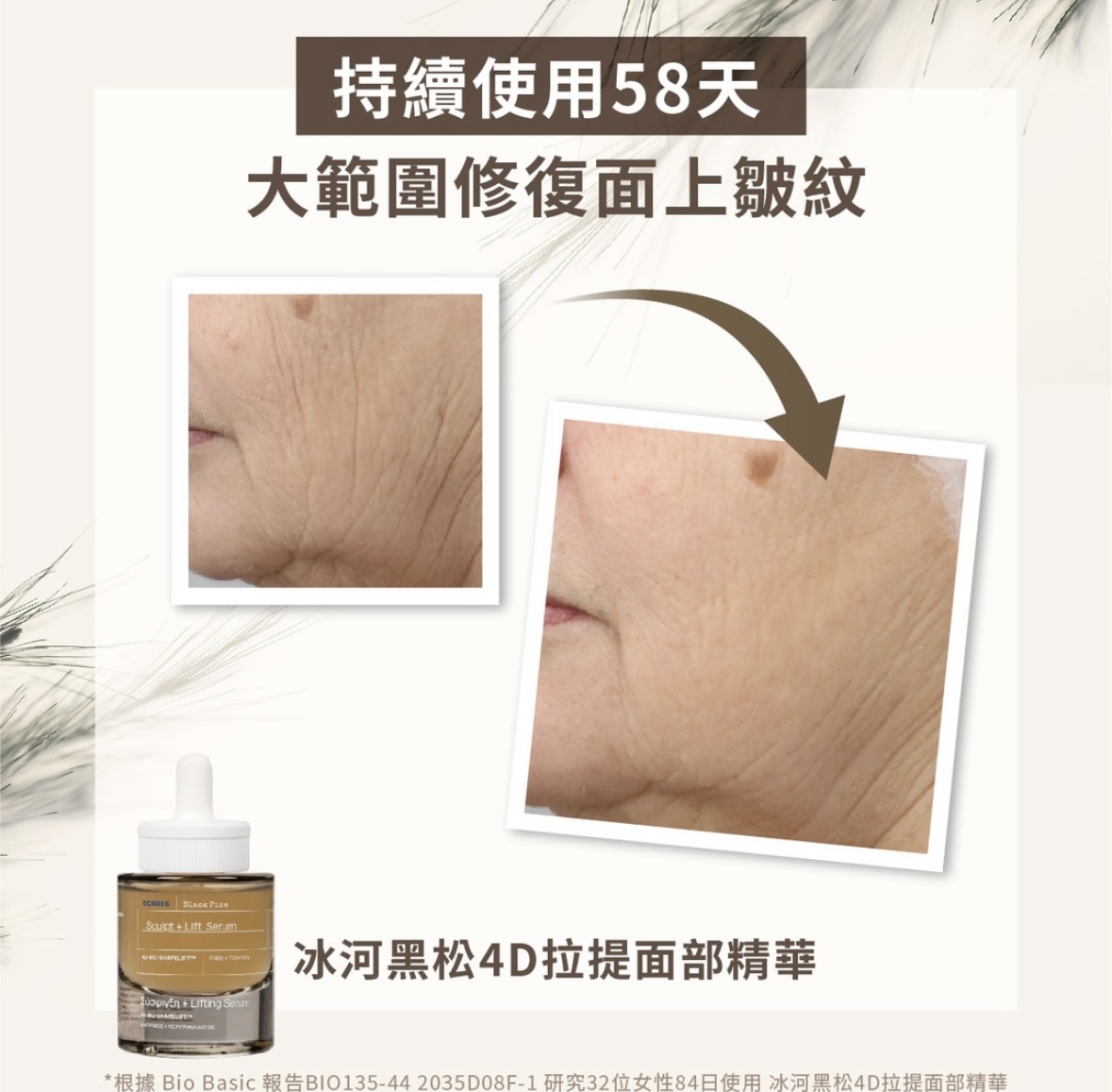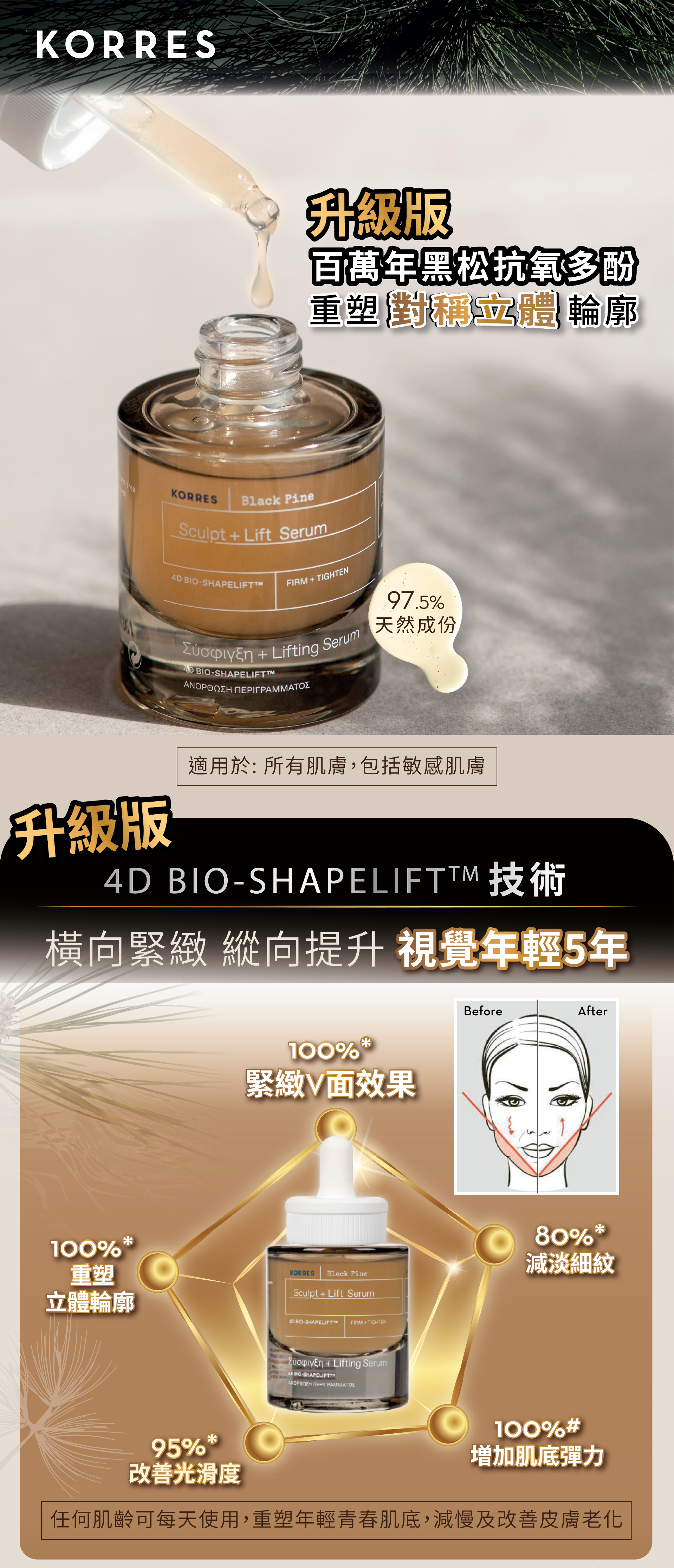 「升級版」冰河黑松4D拉提面部精華以全新 4D BIO-SHAPELIFT™ 技術,提升肌底彈力,進一步為妳塑造平滑透亮、澎潤彈實、緊緻拉提及對稱塑形之四維完美輪廓。