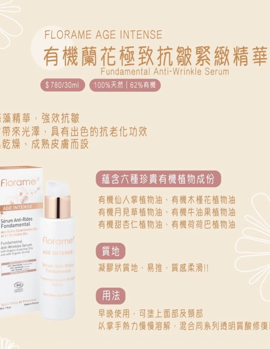 The Florame Age Intense Fundamental Anti-Wrinkle Serum, with an oil gel texture that melts onto the skin, offers a combination of technical and sensory properties that help restore the skin’s comfort and youth. Its active and nourishing formula is an effective concentrate obtained from the synergy of 6 organic precious vegetable Oils* with exceptional anti-aging benefits, to tone and protect the skin thanks to their high content in vitamin E and phytosterols. It is combined with Acmella oleracea and microalgae to reduce wrinkles and brighten the complexion naturally. The truly revitalizing essence of this treatment reveals the beauty of more supple, smoother and younger skin.