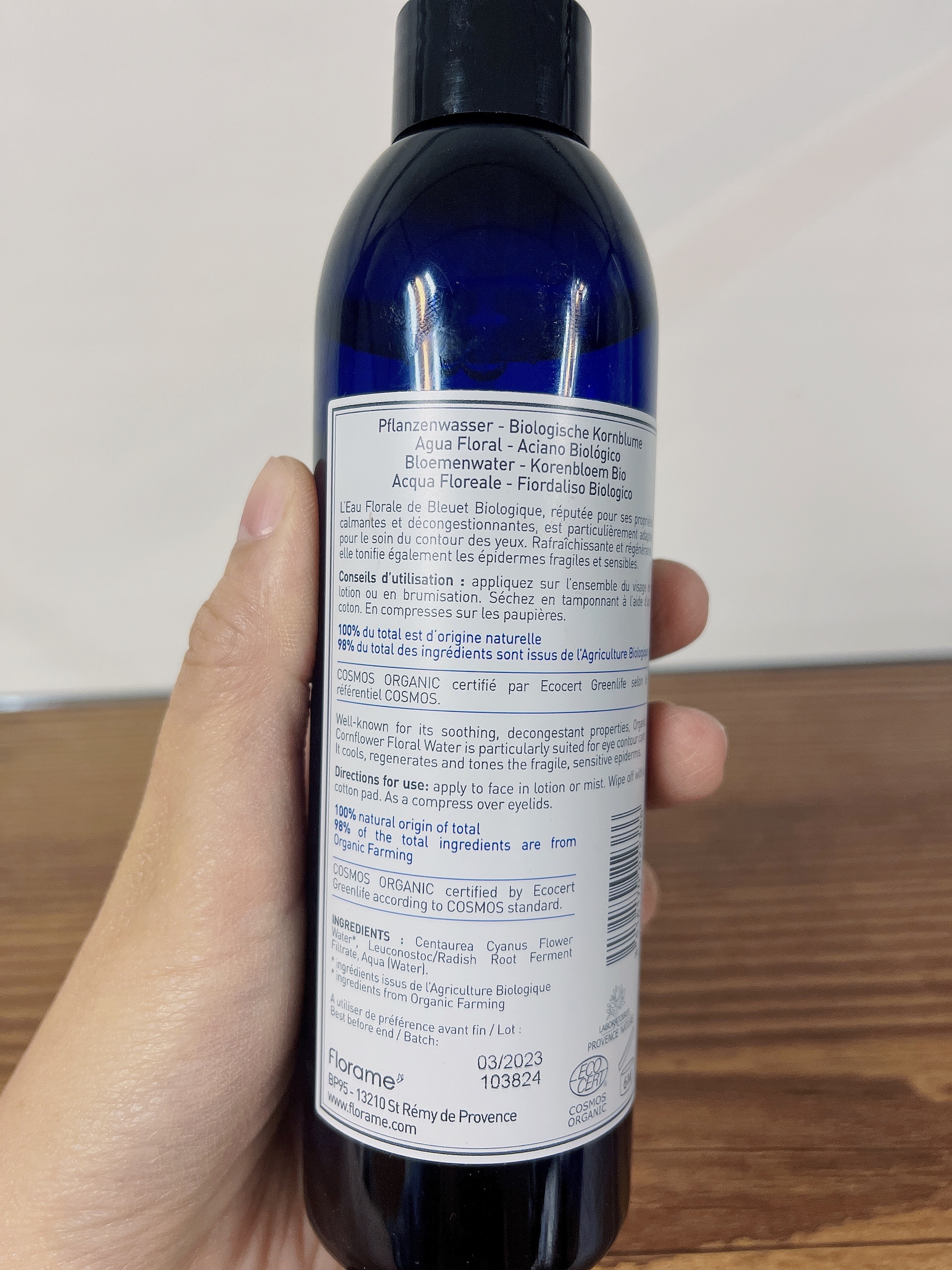 Organic Cornflower Floral Water is known for its calming and refreshing properties, it soothes fragile and sensitive skin. It is particularly adapted to soothe eyelids and the fragile eye contour.