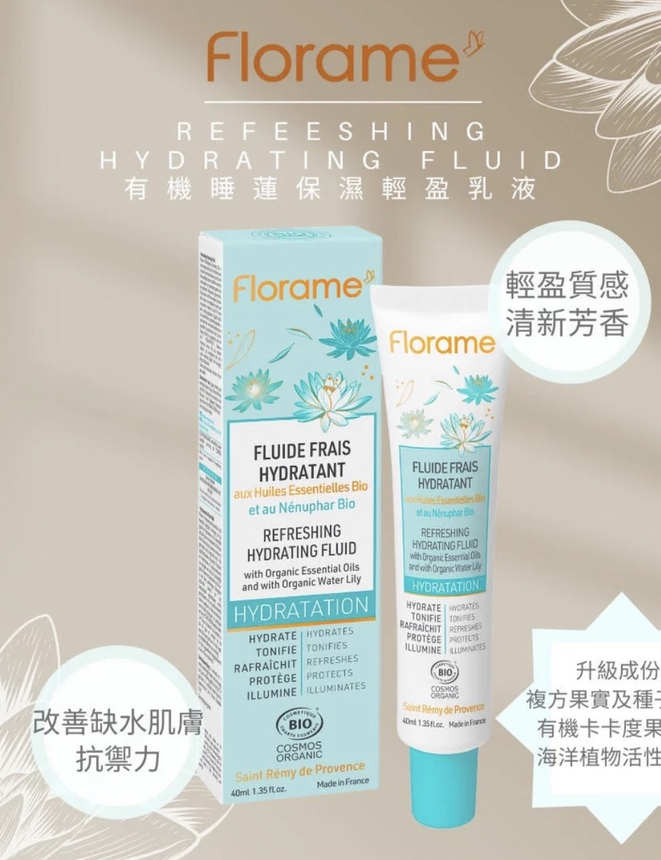 Florame Refreshing Hydrating Fluid is all you need to hydrate your skin and reveal its natural radiance. The lightweight, refreshing texture is perfect for normal to combination skins and penetrates fast without leaving any oily residue.