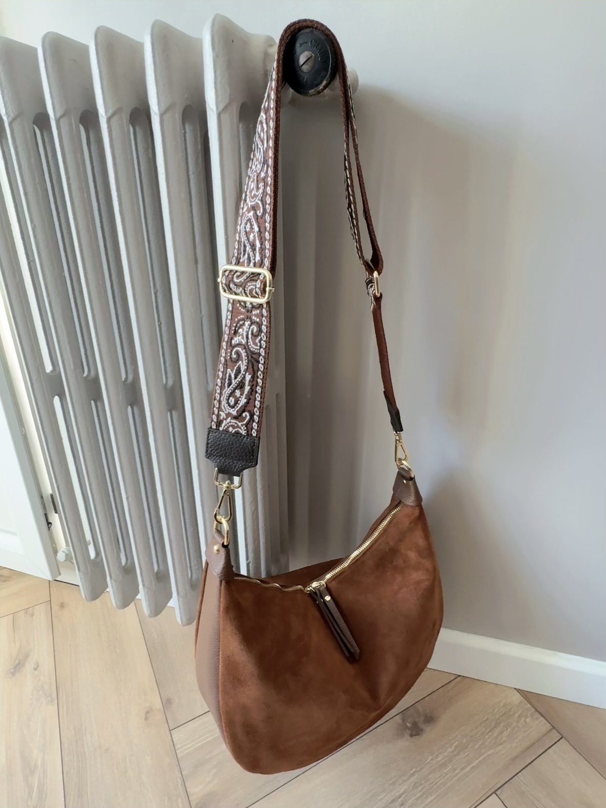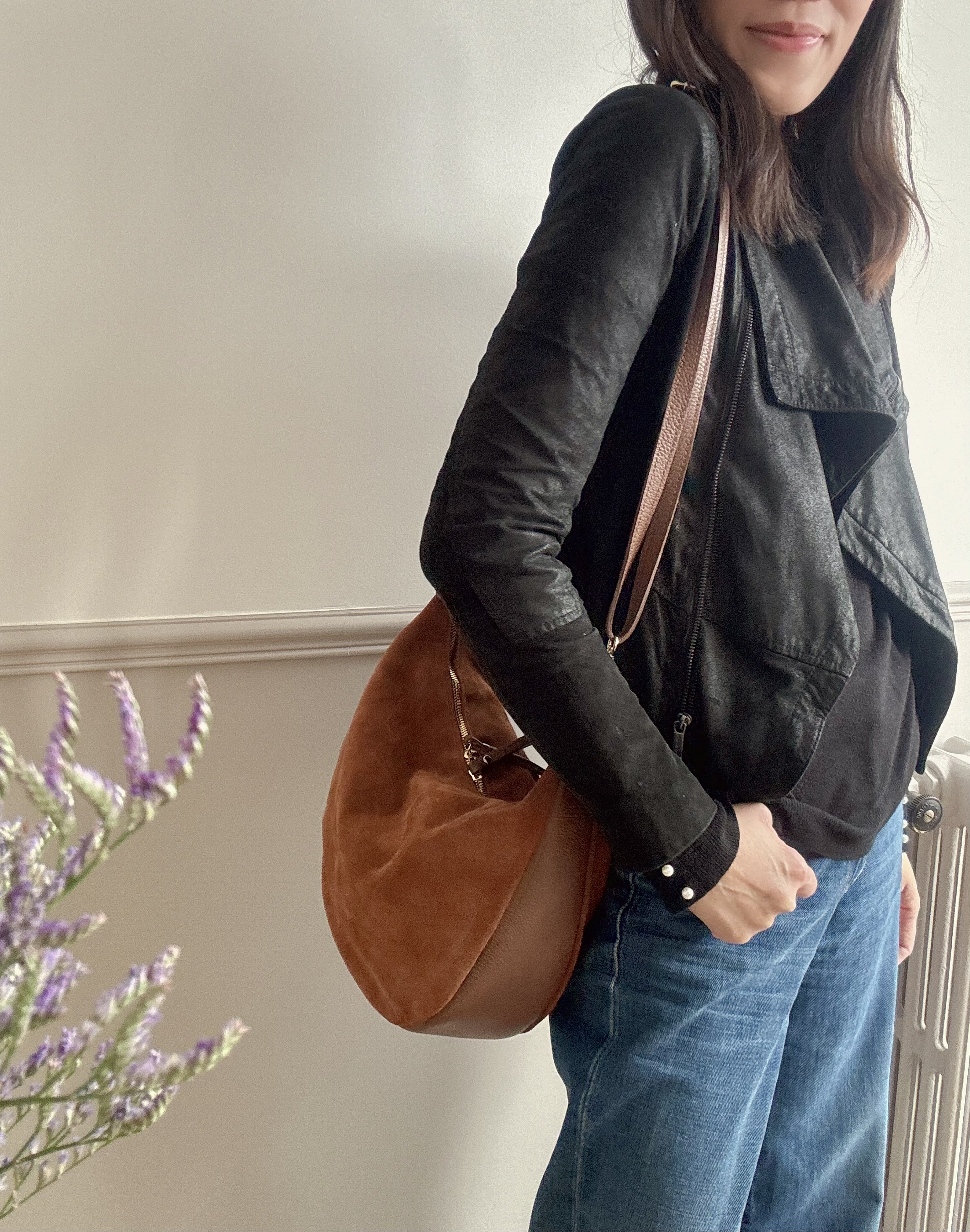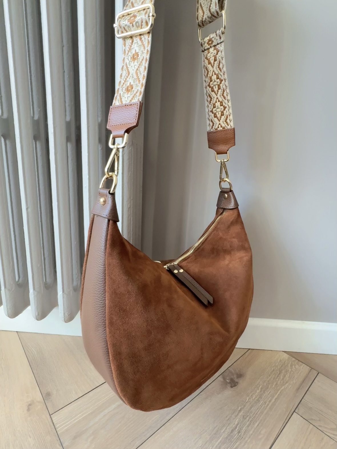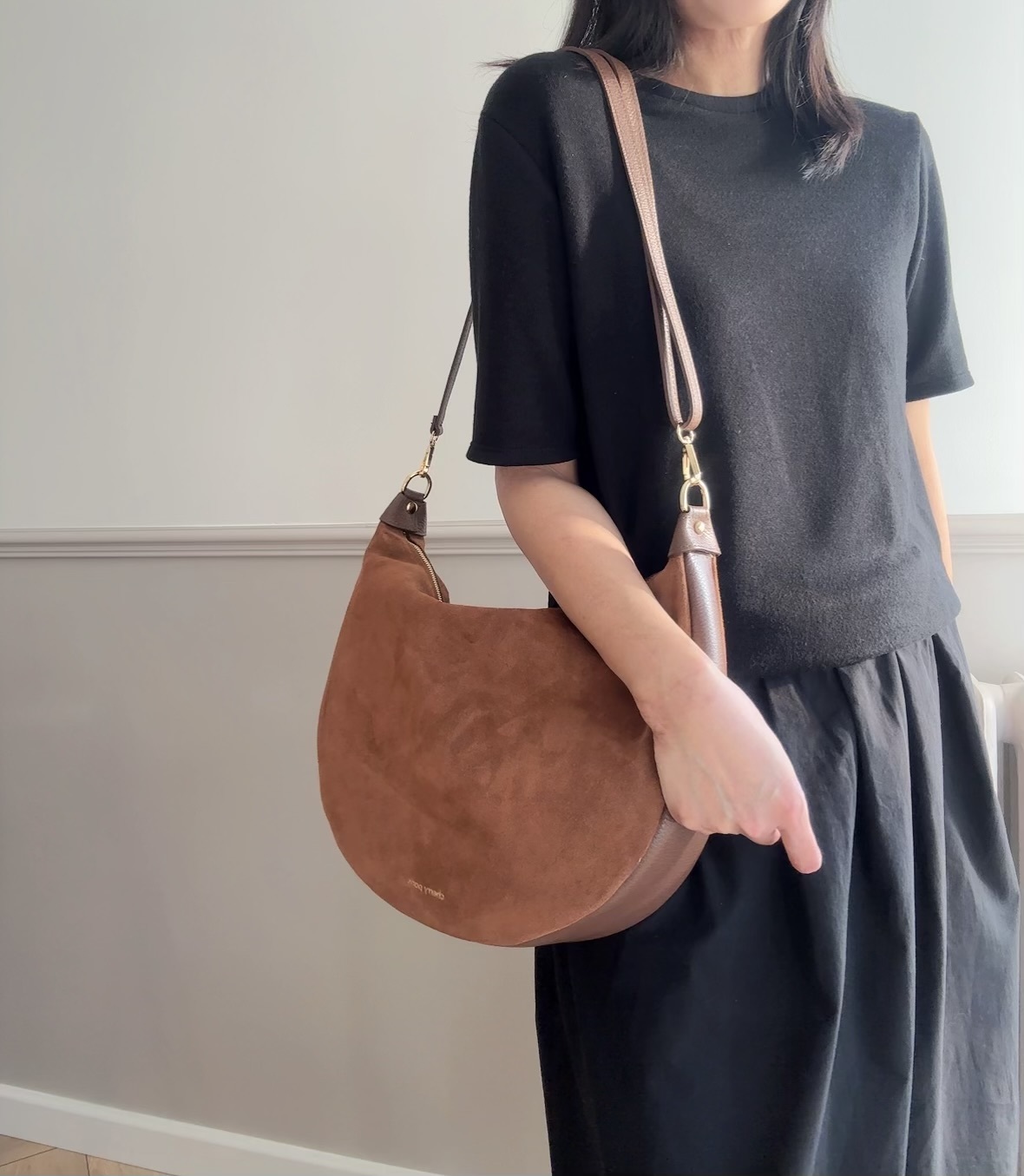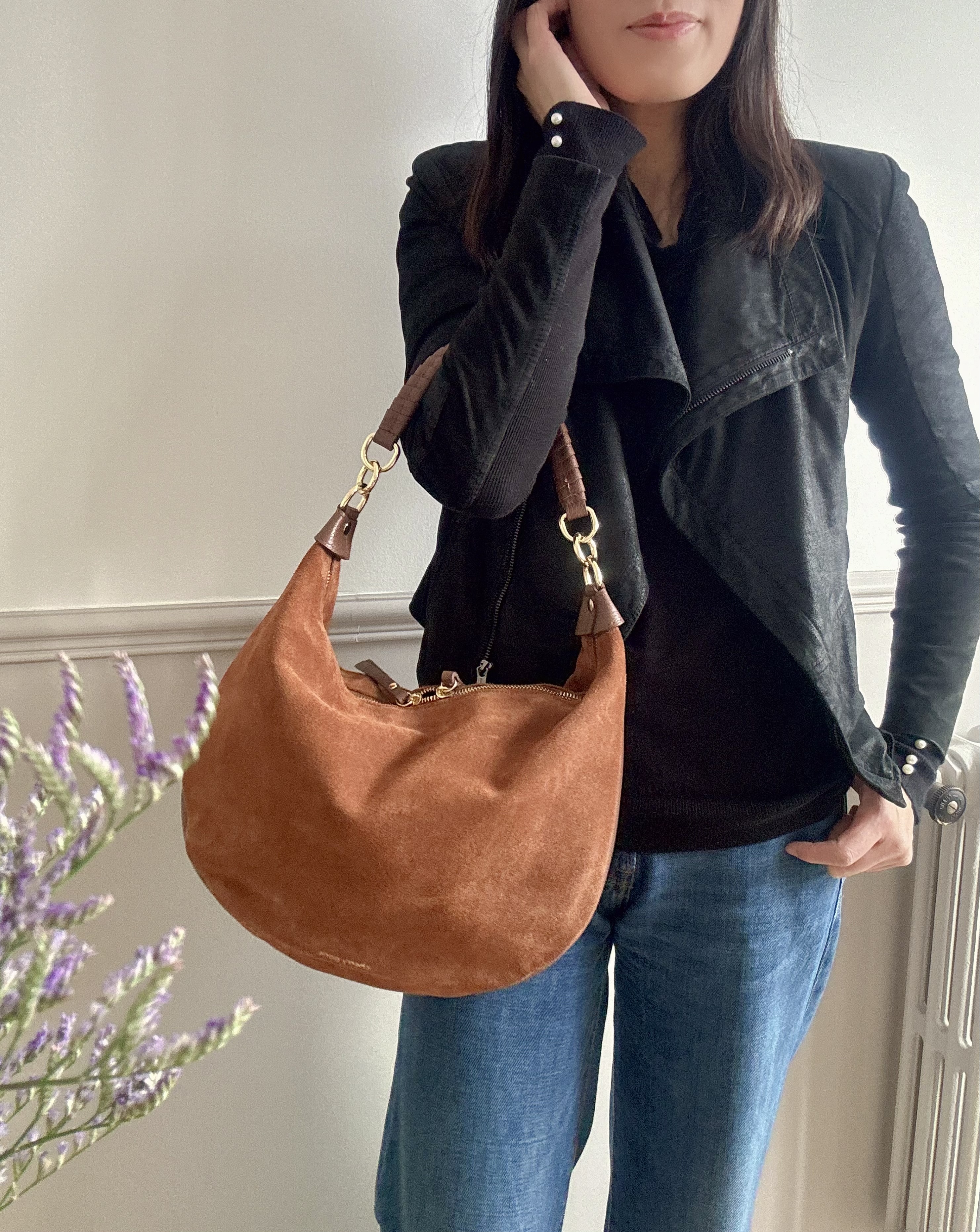 • Shoulder bag in split suede cowhide leather and grained cowhide leather.
