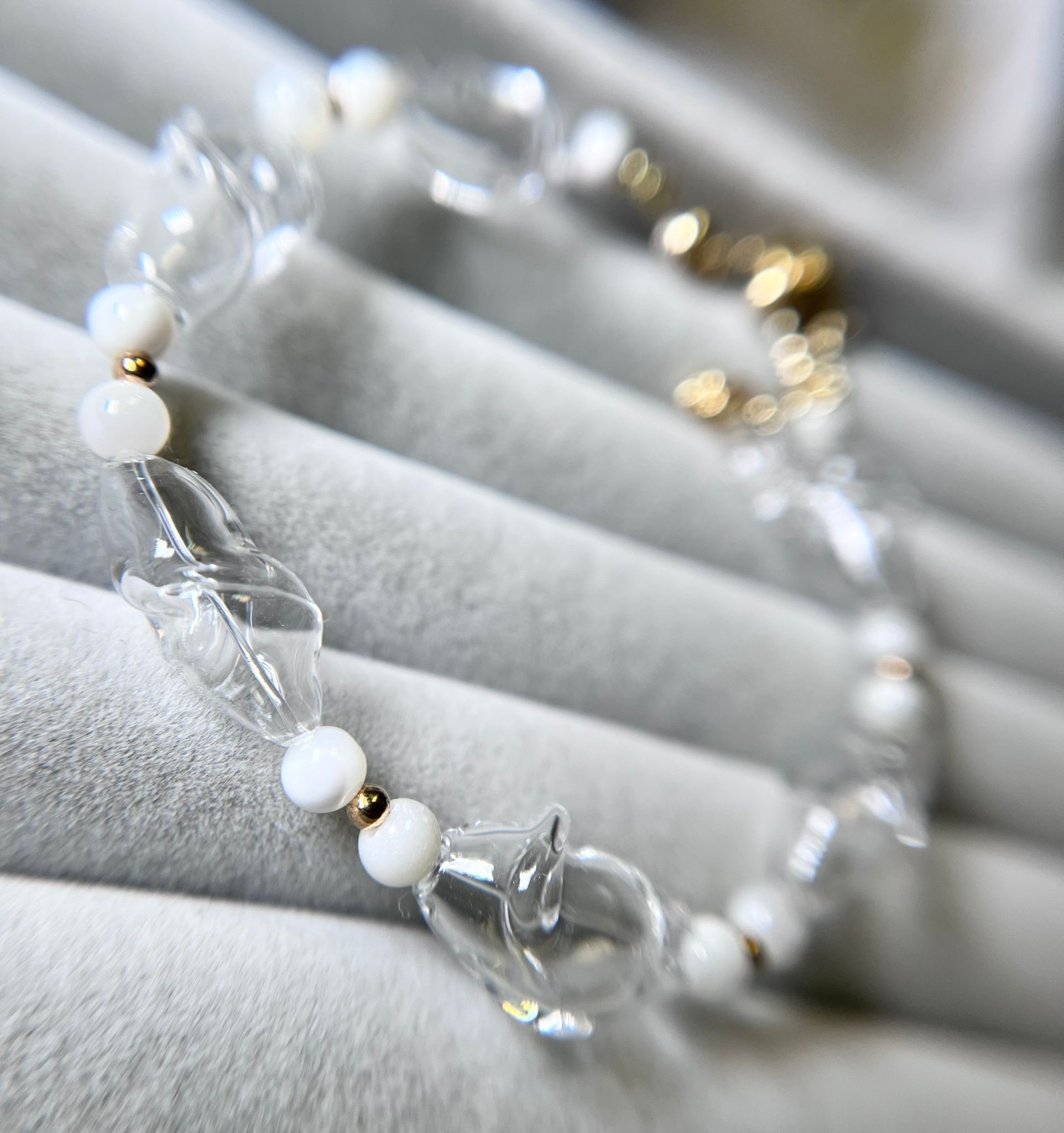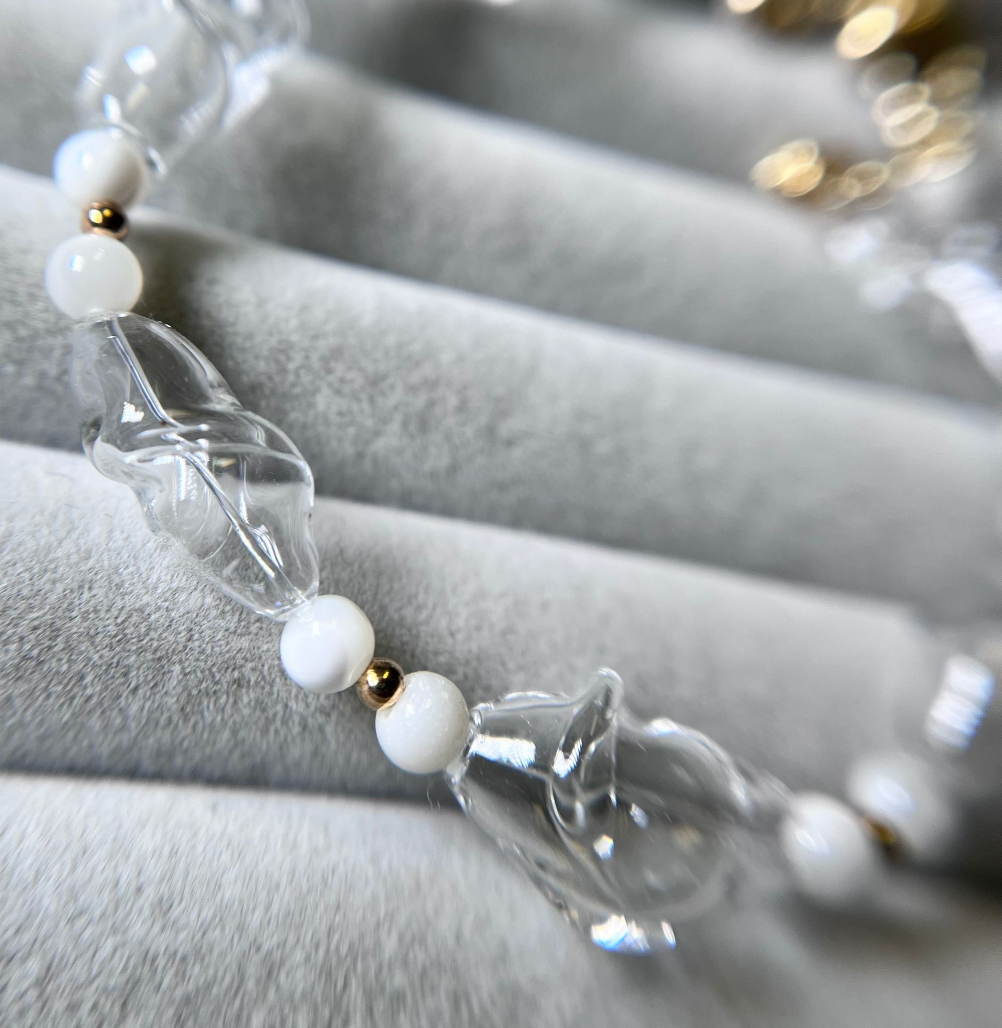 Sorela is a jewel that speaks of unity, intuition, and beauty that needs no flair. Its shape flows like a conversation between sisters, between waves, between times. Each bead has a soft and vibrant texture, as if the sea has patiently polished it. Among them are pearls that recall the calm of the seabed and others that shine like sunlight reflected on the surface. Sorela is a tribute to shared femininity, to wordless complicity, to the power of softness.