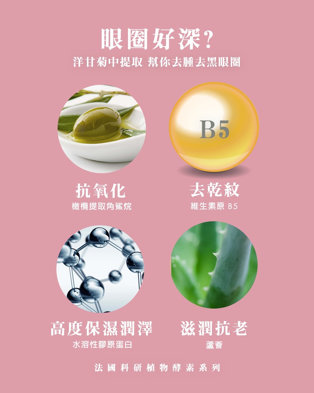 • 使用方法: 沿眼眶骨塗於眼部,周圍,從內到外角落輕輕按摩以幫助滲透,注意避免眼皮。