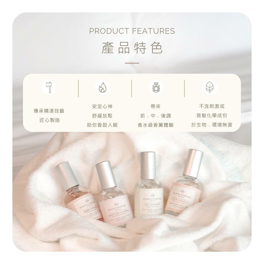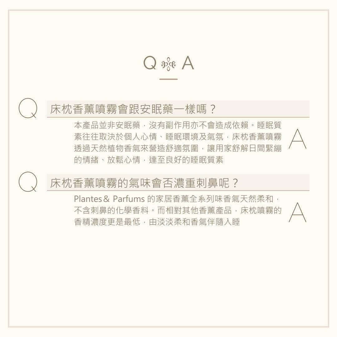 來自普羅旺斯的法式柔和香氣,採用法國「香水之都」格拉斯天然香水調製而成,為床枕帶來煥然一新的感覺。在夜間憑藉香氣療癒心靈,紓解一整天的壓力,酣睡於自然芳香之中,帶來安眠享受。