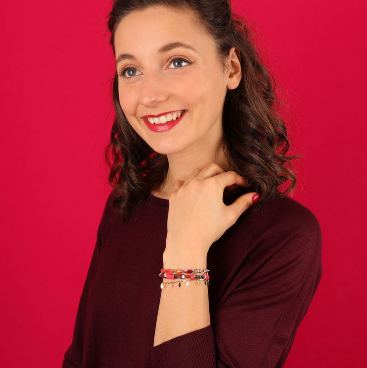 Composition : metal, hand-painted colored resin, glass beads, heishi beads, tinted agate