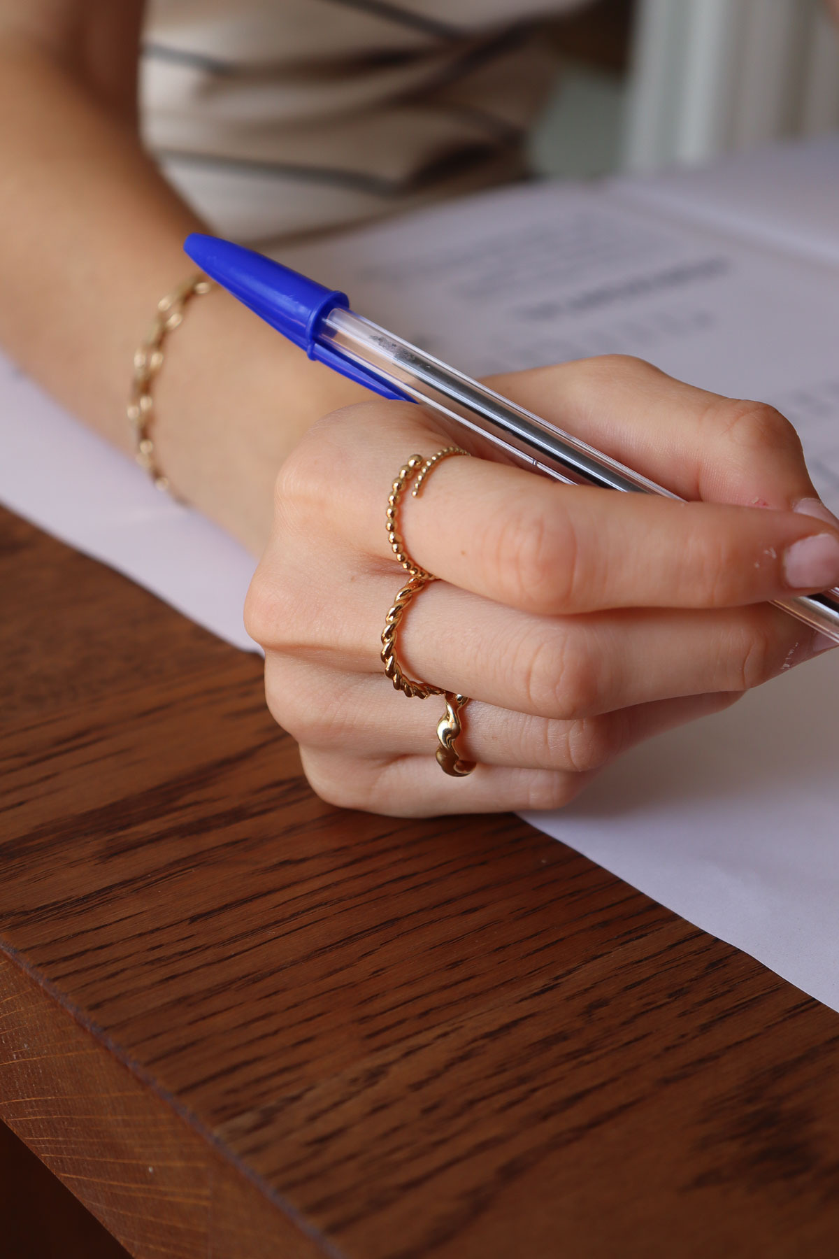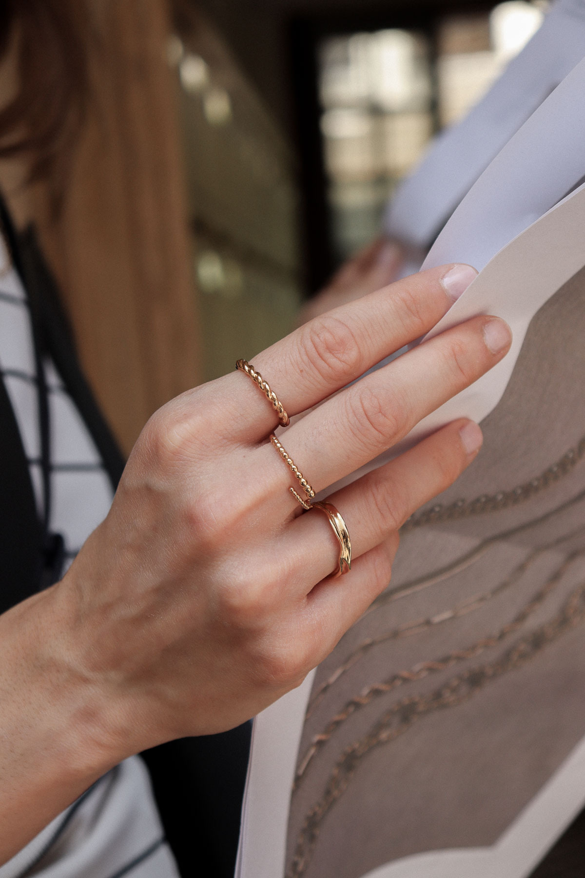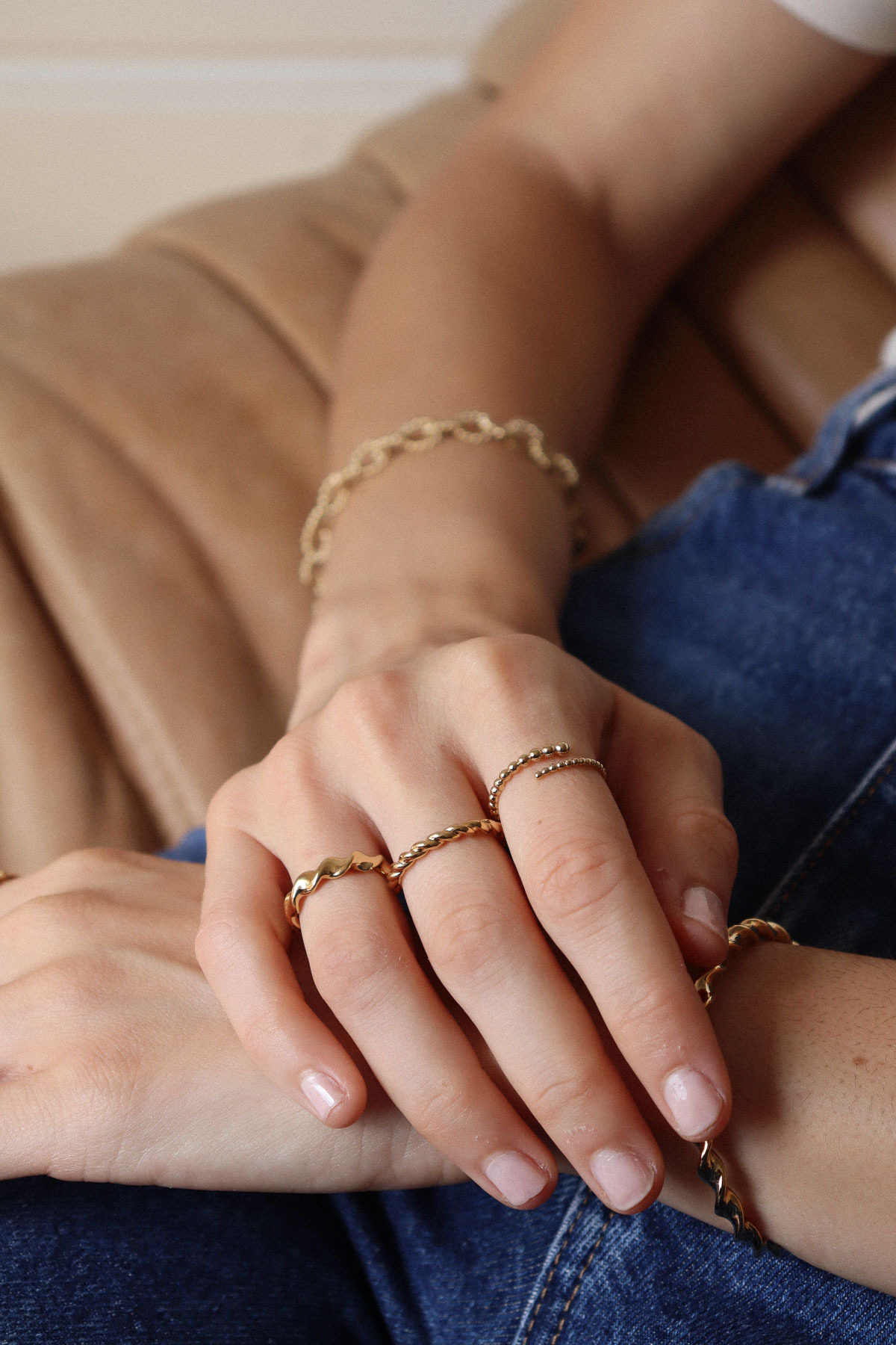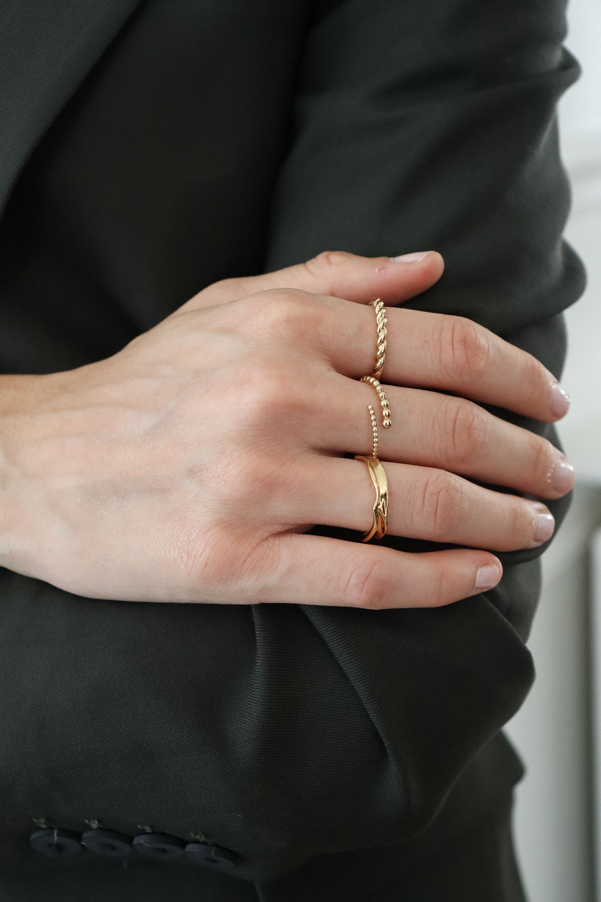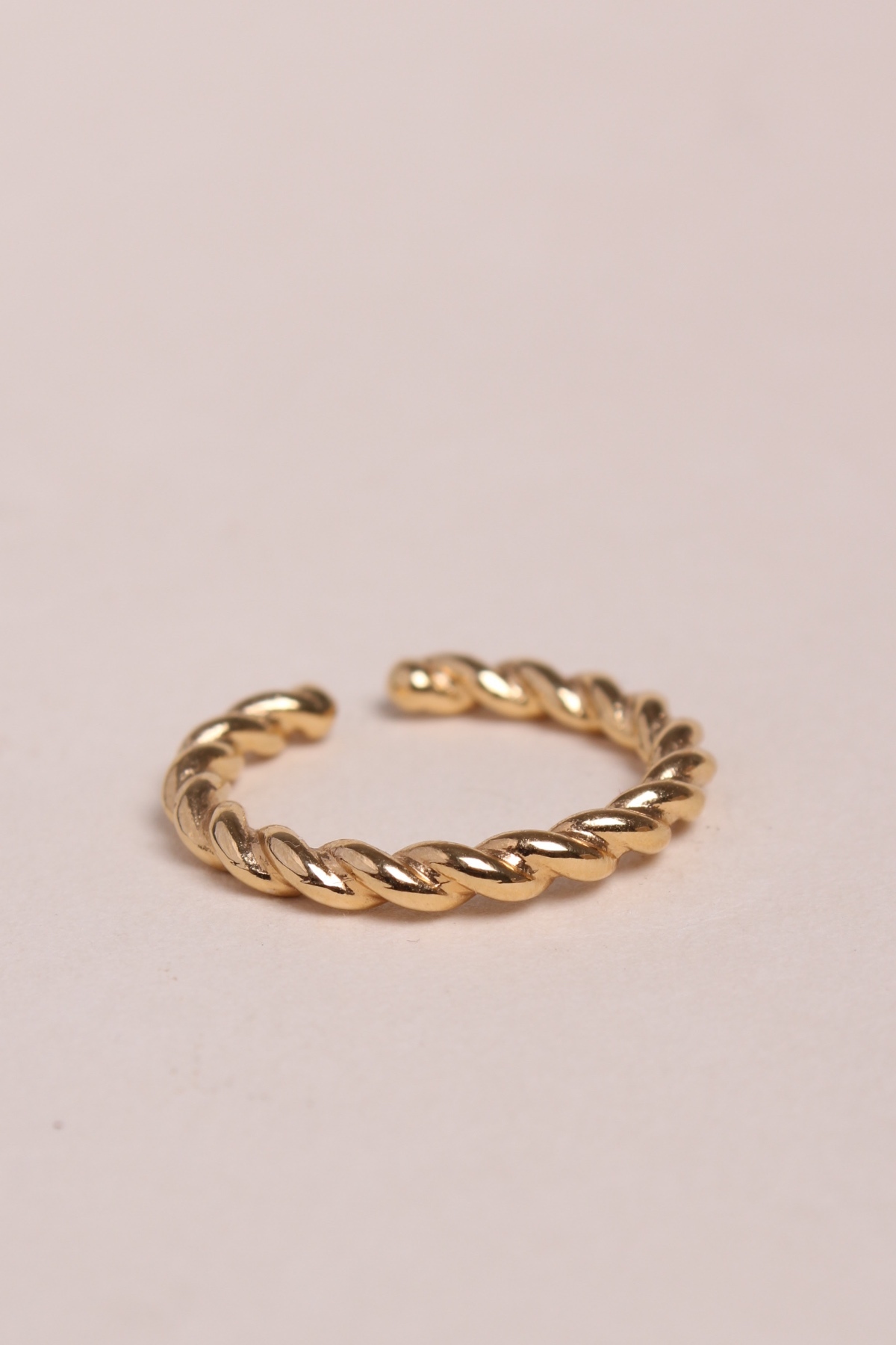 A braided pattern like gold thread on your finger. Slightly thick, an elegant and feminine ring with 3 micron gold-plated.