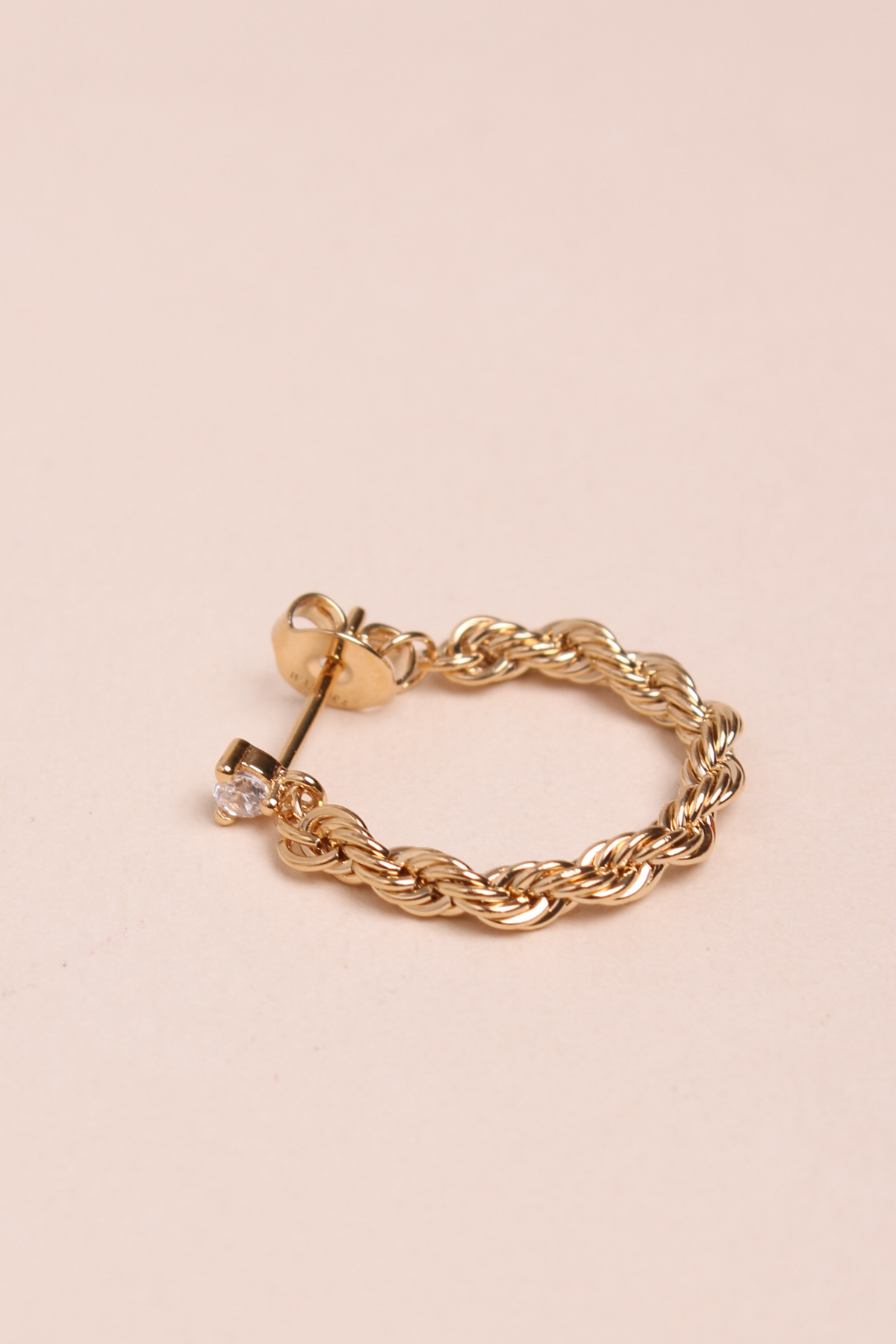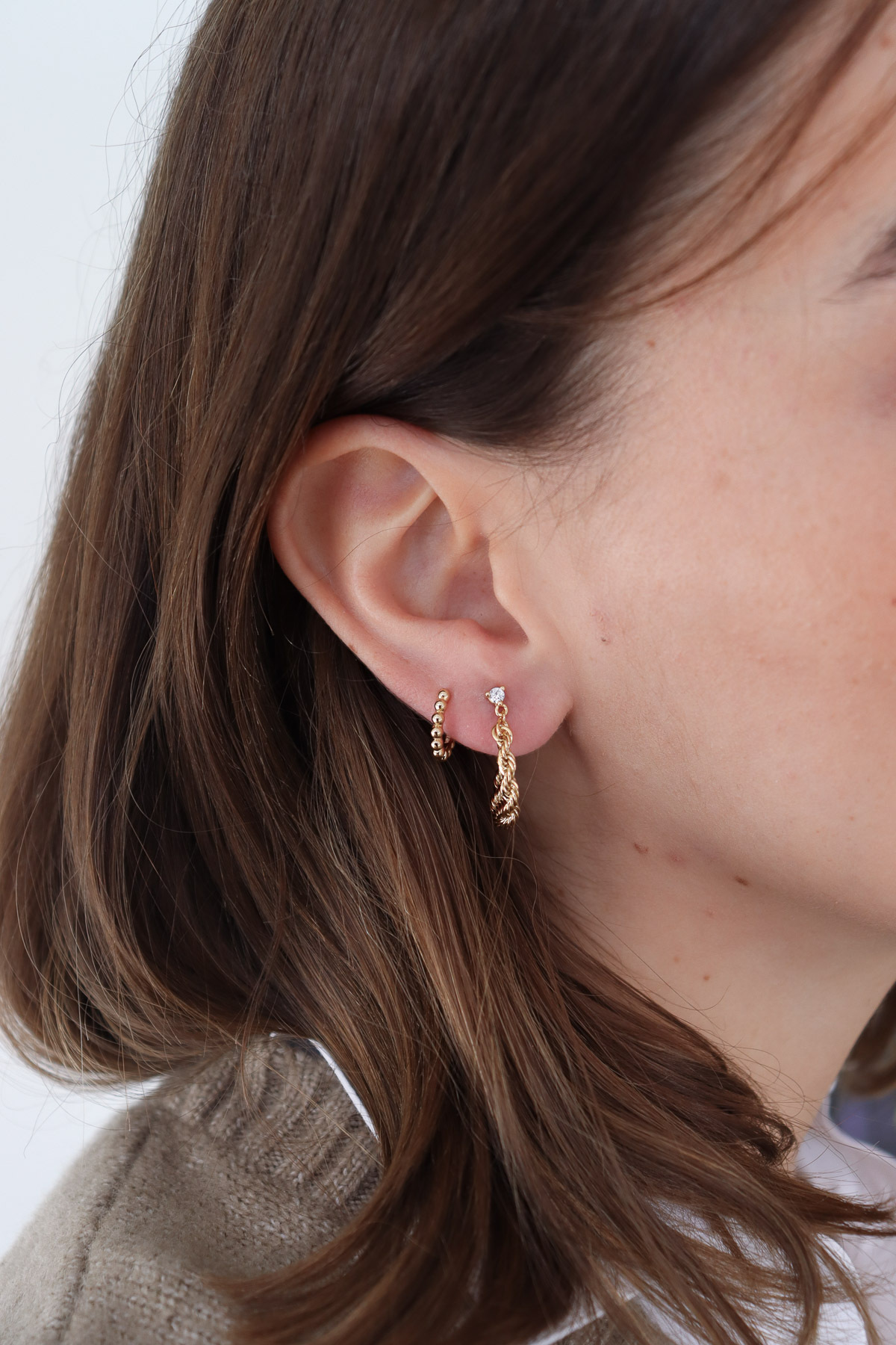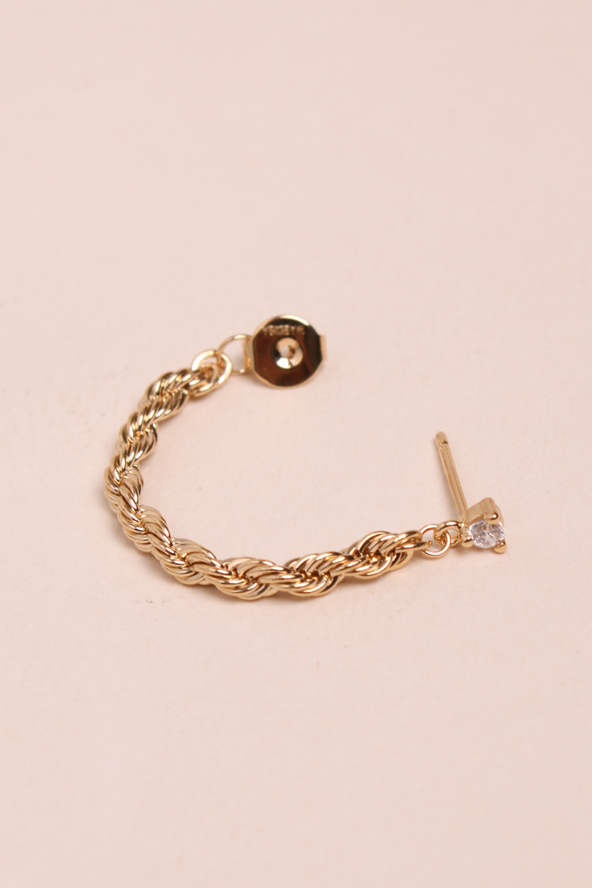 A small ear stud accompanied by a twisted chain, to wear alone or to complete with another pair, in 3 micron gold plated